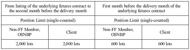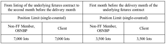 For any Non-FF Member, OSNBP, or Client, the total positions of long calls and short puts of any particular contract month, as well as the total positions of long puts and short calls of any particular contract month, should in each case not exceed the position limit listed below. Accounts linked by actual control relationship are treated as a single account for the purposes of position limit.